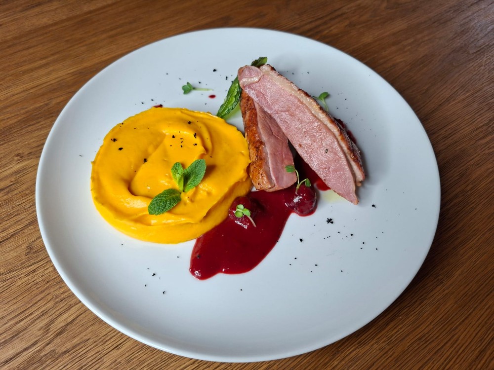 Качина грудка з бататово-морквяним пюре
